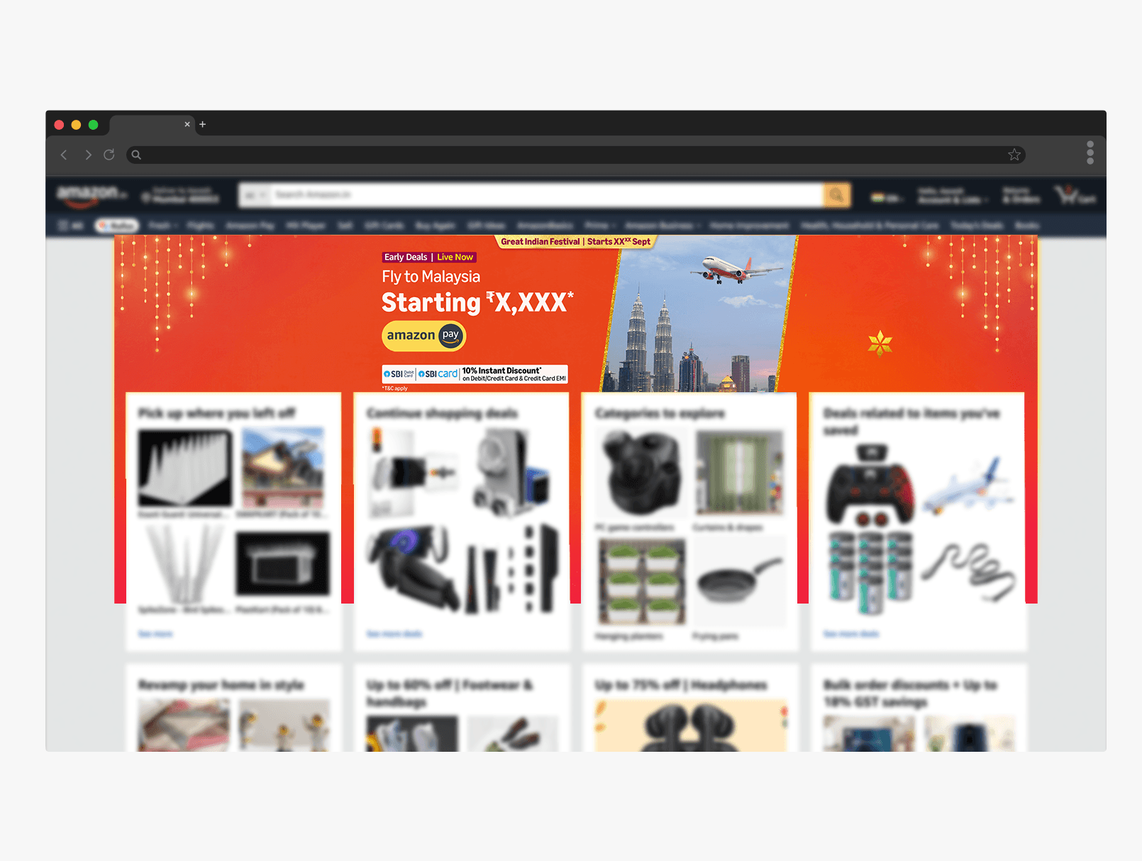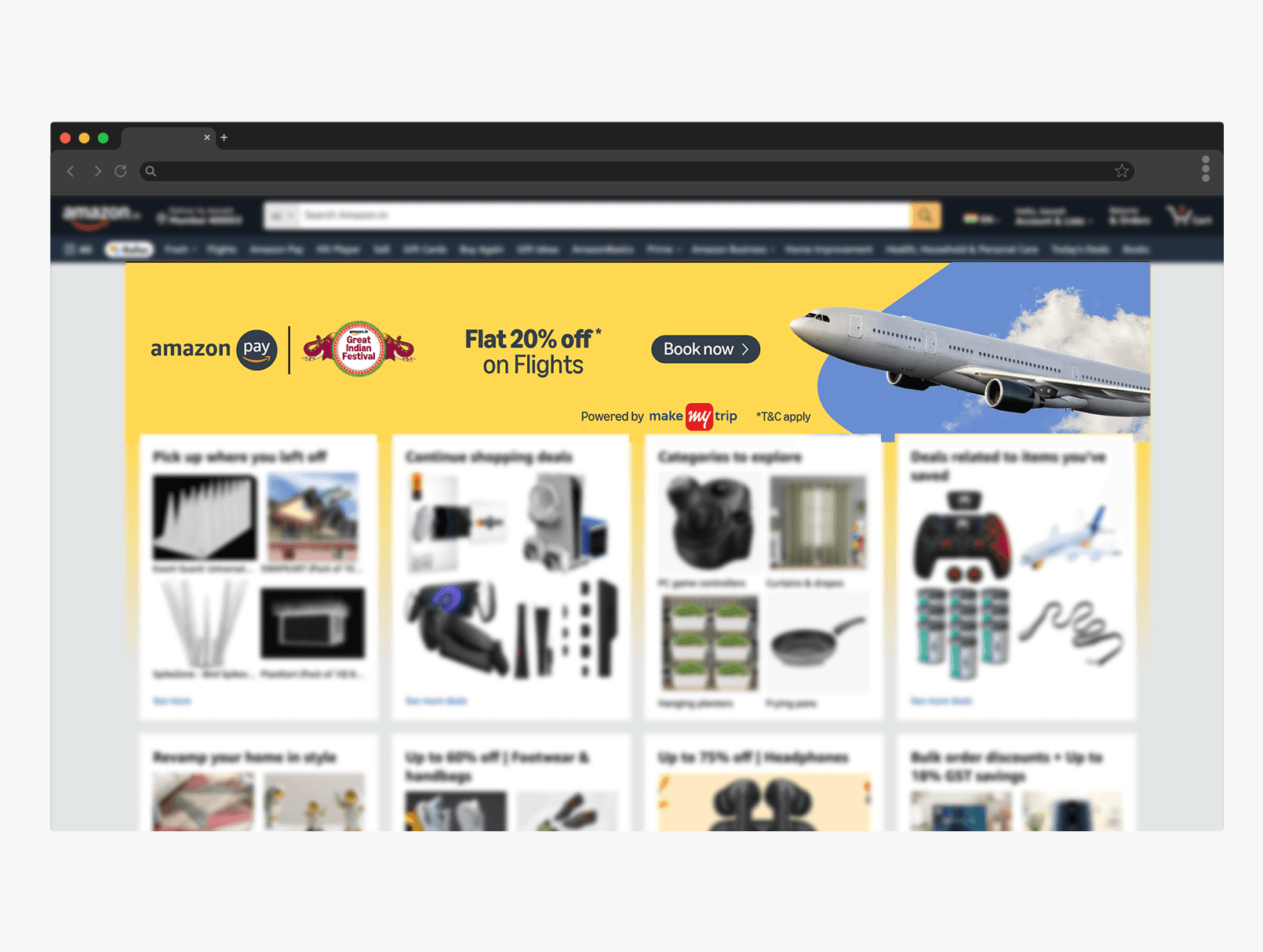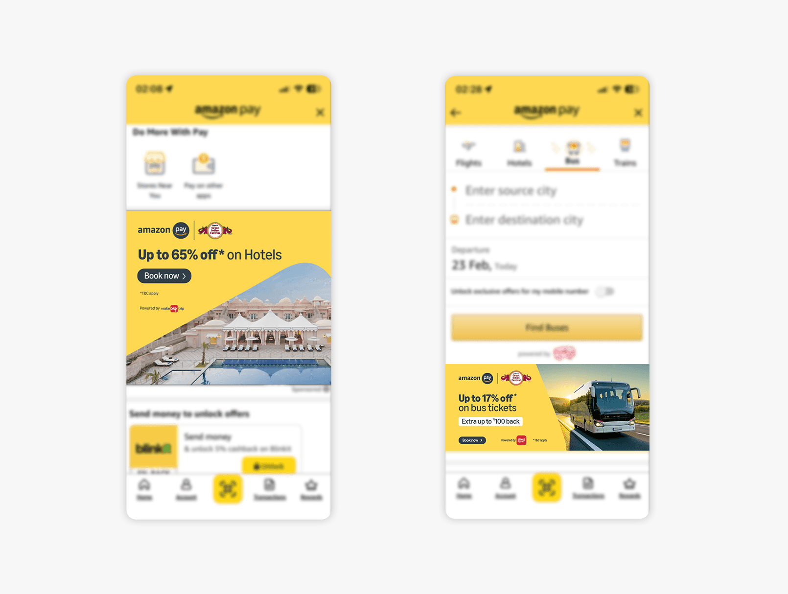 Amazon Pay required rapid visual communication during the Great Indian Festival across flight, bus, and hotel bookings. Deliverables spanned app, website, emailers, vendor collateral, and digital placements, all governed by extremely strict brand and layout rules.